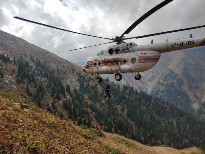 На борту АО "Казавиаспас" сотрудники РОСО эвакуировали туриста до вертолетной площадки в Большом Алматинском ущелье, где его передали сотрудникам Центра медицины и катастроф.