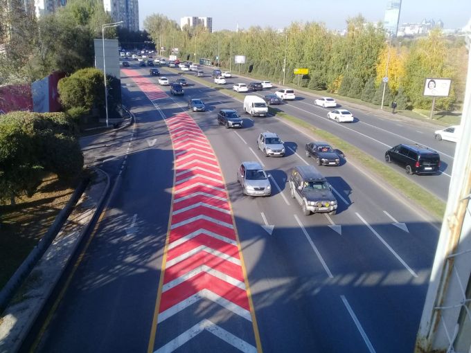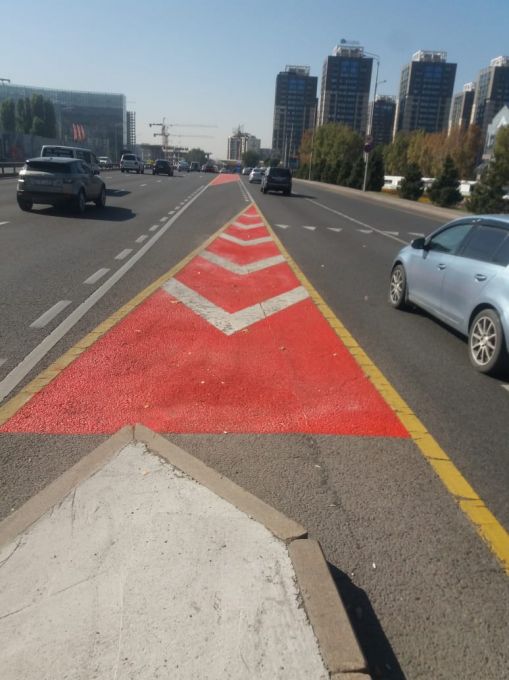 На данный момент такая разметка нанесена на пр. Аль-Фараби, ул. Сыргабекова, Водозаборная, Желтоксан, Бухтарминская и несет информационный характер.