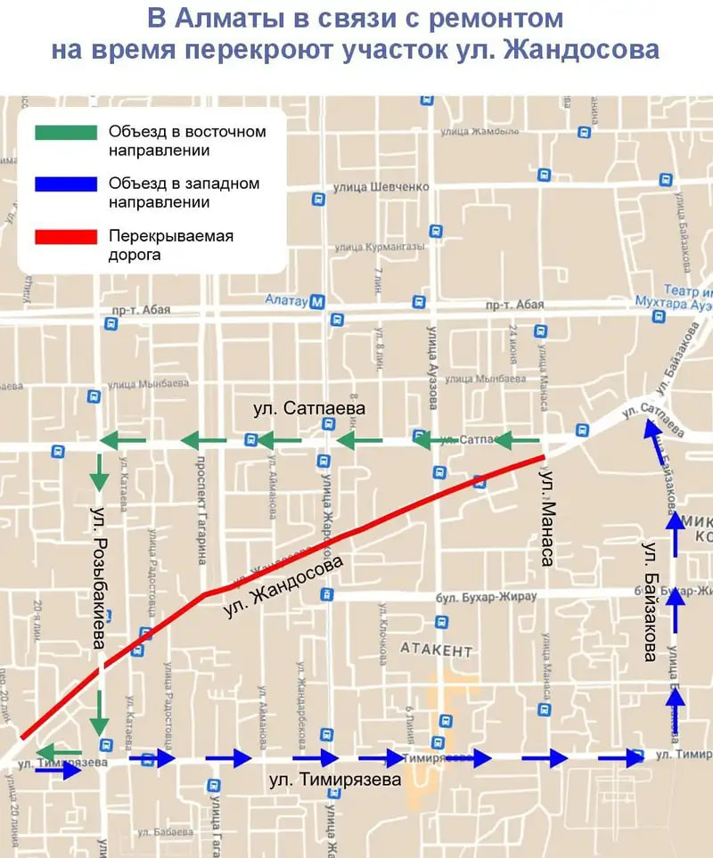 Объезд обеспечат в восточном направлении по улицам Сатпаева и Розыбакиева. В западном направлении по улицам Тимирязева и Байзакова.