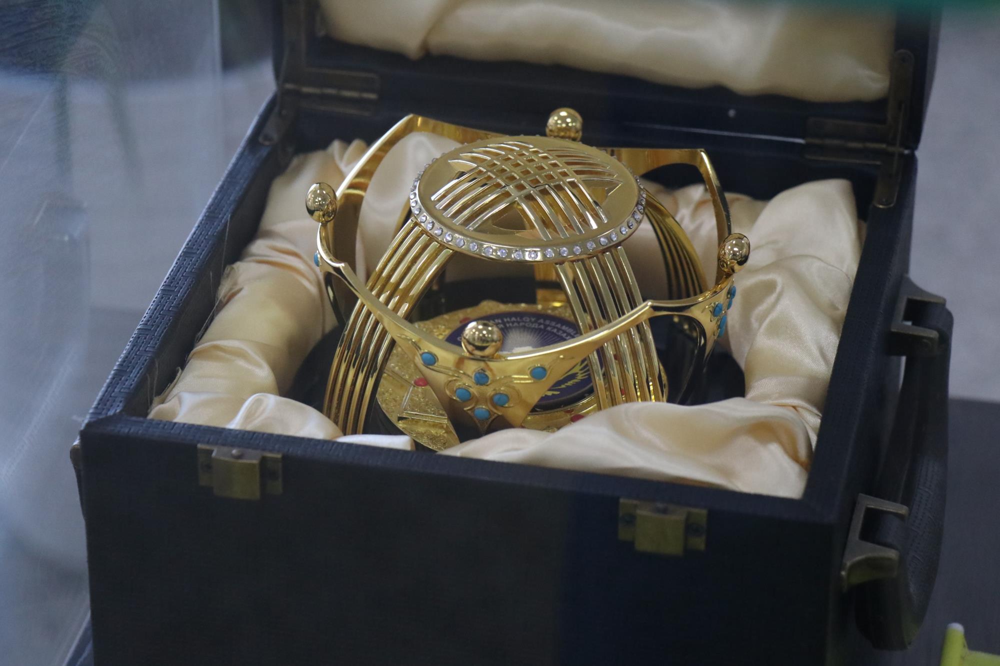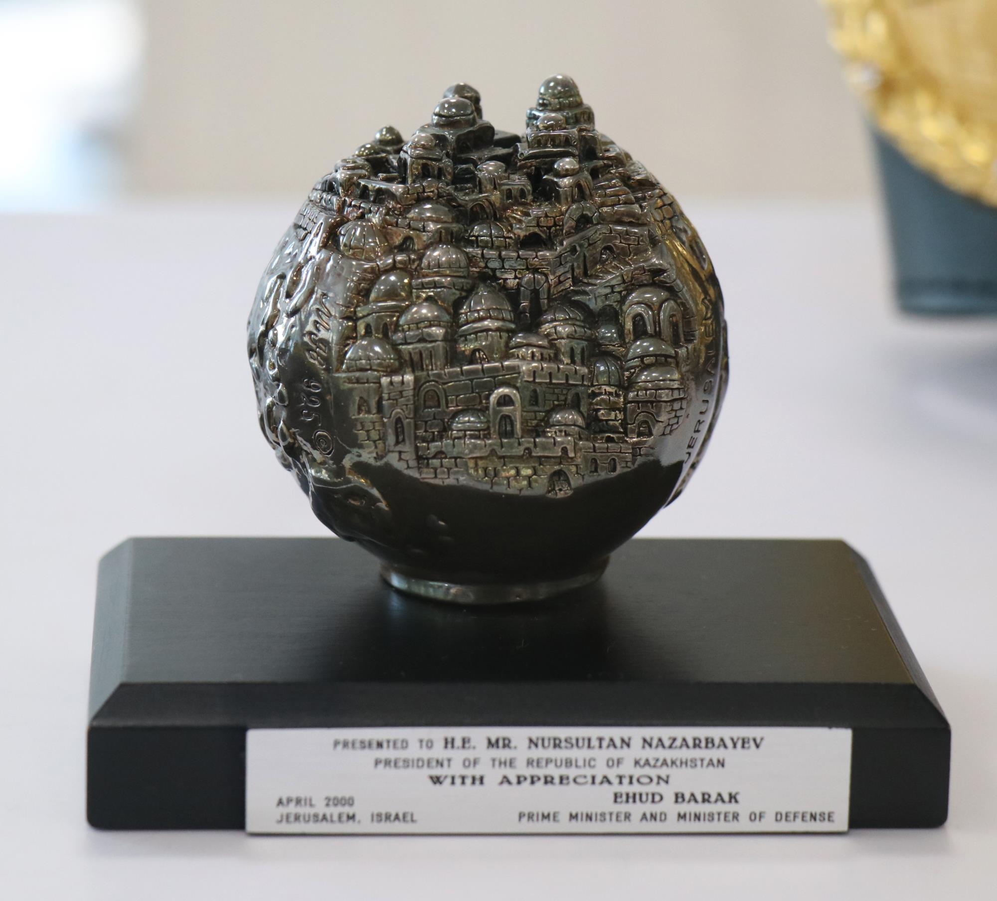 — В основном серебряные тарелки. Из Китайской Народной Республики привезли красную фарфоровую тарелку с изображением золотого дракона. Подарок президента Турецкой Республики, Реджепа Тайыпа Эрдогана — картина, на которой на черной шторке написано «Бисмиллях». В коллекции музея — интересная подставка для ручек из Израиля: город Иерусалим изображен в виде глобуса. Это подарок премьер-министра Израиля Эхуда Барака в 2000 году. И много других.