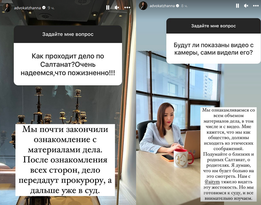 Она также отметила, что видео, входящие в материалы дела, очень жестокие, и ей с ее коллегой тяжело смотреть их. Жанна добавила, что показывать видео публике не стоит из уважения к чувствам семьи Салтанат.