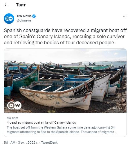 Глава испанской НПО Caminando Fronteras Хелена Малено, которая помогает лодкам мигрантов, попавшим в беду в море, и работает с семьями, разыскивающими своих близких, сообщила в Twitter, что ее организация получила сигнал о лодке, вышедшей в море 24 сентября недалеко от города Эль-Аюн.