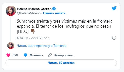 — Семь дней боли и ожидания, в течение которых не было никаких новостей. Семь дней, которые закончились вчера сообщением о новой трагедии на одном из самых смертоносных миграционных маршрутов — Канарских островах, — написала Малено в Twitter.