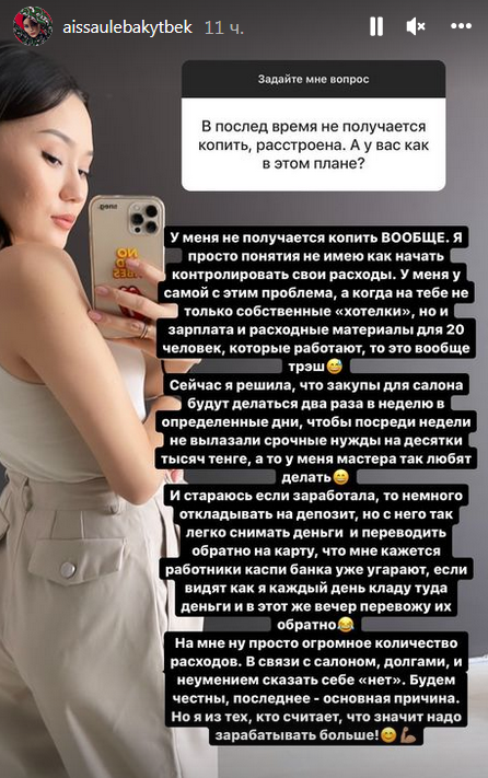 Об этих обстоятельствах Айсауле рассказала в ответ на вопрос в Instagram, передает медиа-портал Сaravan.kz. Подписчица пожаловалась, что расстроена, потому что не получается копить в последнее время, и спросила, как обстоят дела в этом плане у Айсауле.