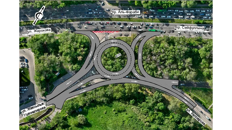 «Так, предлагается возвести кольцо южнее Аль-Фараби с поворотными съездами с/на Ушкемпирова и Каппарова. Этот вариант имеет преимущество в виде малой площади, наименьшего сноса зеленых насаждений, обеспечения всех левых поворотов. Но будут и недостатки – отсутствие левого поворота с Аль-Фараби, если двигаться в западном направлении, для этого все так же придется разворачиваться на Жарокова.»
