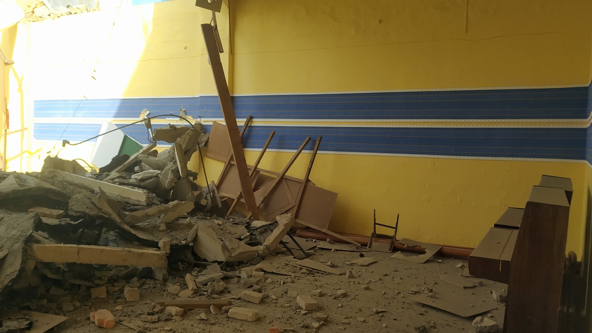 — На уроке немного осыпалась штукатурка. После урока мы детей вывели, актовый зал был закрыт.