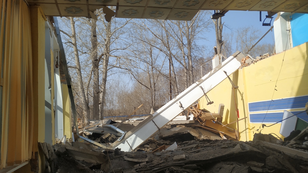 Первое, что бросается в глаза — это небо. Открытое небо. Его перекрывает болтающаяся на обломке потолка люстра. За ней — огромная бетонная балка, которая врезалась в полуразрушенную сцену. Сбоку на уцелевшем куске стены на разбитом окне от ветра колышутся жалюзи.