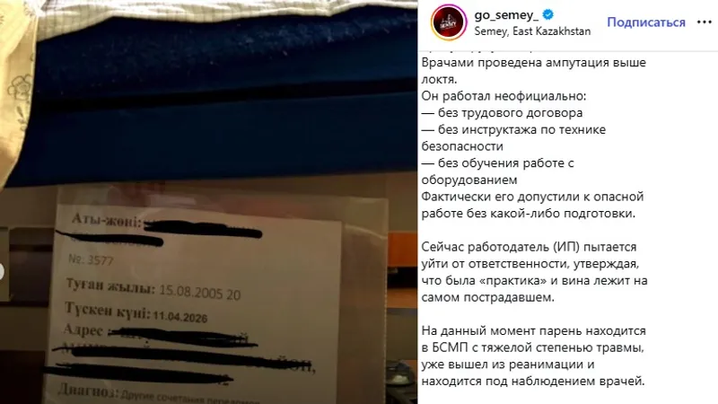 Информация об этом появилась в социальных сетях. В описании к фото с покалеченным 20-летним парнем говорится, что 11 апреля 2026 на стройке в компании «Abai eli» ему оторвало правую руку аппаратом для стяжки. Врачи провели ампутацию выше локтя, передает Caravan.kz.