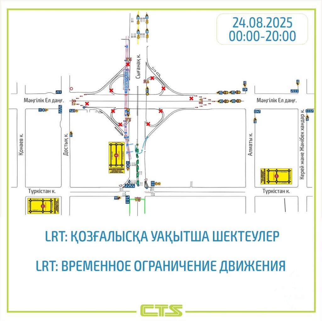 «24 августа с 00.00 до 20.00 в связи с плановыми работами на линии LRT в обоих направлениях будет полностью ограничено движение транспорта по проспекту Мангилик Ел на развязке с улицей Сыганак», – говорится в сообщении.