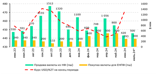 В июле по заявкам правительства Нацбанк планирует продать от $450 до $550 млн, что примерно на $100 млн больше, чем в июне. Кроме того, Нацбанк планирует купить для ЕНПФ от $250 до $350 млн. То есть чистая сумма продаж валюты Нацбанком на бирже увеличится примерно на $100 млн.