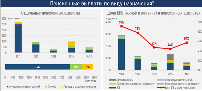С момента внедрения возможности досрочного изъятия пенсионных накоплений (февраль 2021 г.) выплаты по ЕПВ составили 4,8 трлн тенге, что составляет 21 % от текущего портфеля пенсионных активов.
