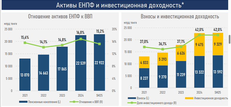 Всего в ЕНПФ находится 22,9 трлн тенге. Это чуть больше, чем 15 % от размера экономики Казахстана. Формально это не очень много, так как пенсионные накопления это всегда «длинные деньги», которые могут стабилизировать экономику страны.
