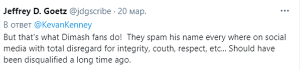 "Но это именно то, что делают фанаты Димаша. Они спамят его имя везде в соцсетях, при этом полностью игнорируя какие-либо границы. Его нужно было дисквалифицировать уже давно".