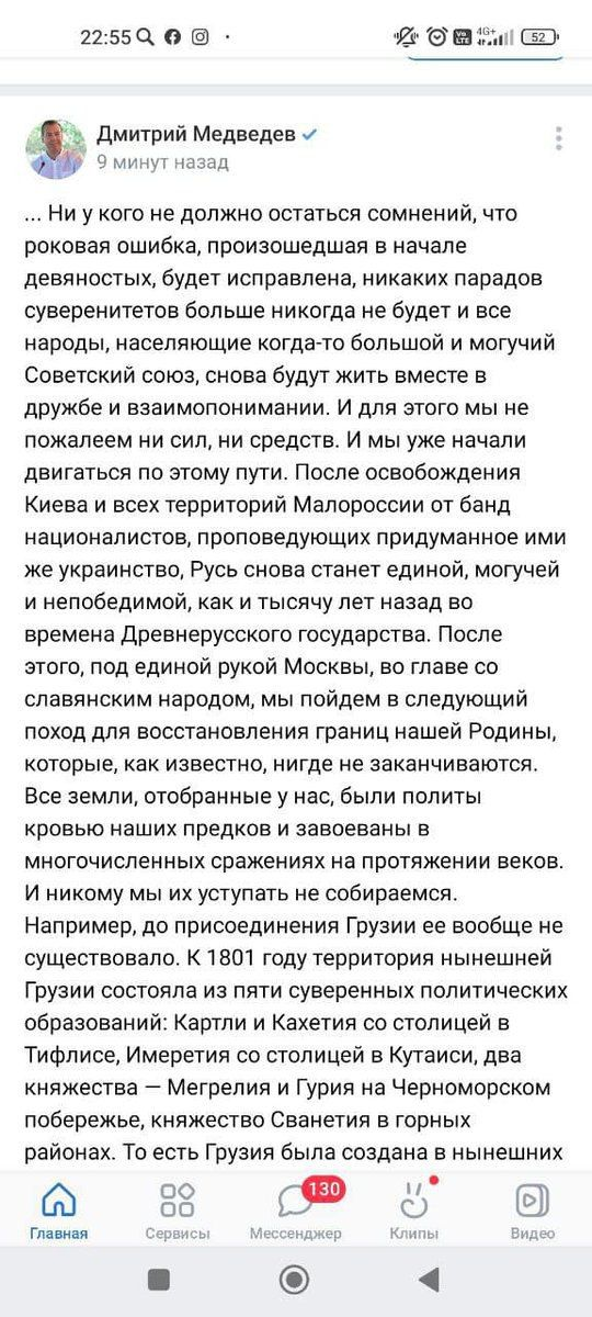 На скриншотах от имени Медведева говорится: "Все народы, населяющие когда-то большой и могучий СССР, снова будут жить вместе в дружбе и взаимопонимании. И для этого мы не пожалеем ни сил, ни средств". Сначала в посте речь идёт о Грузии, а потом и о Казахстане: