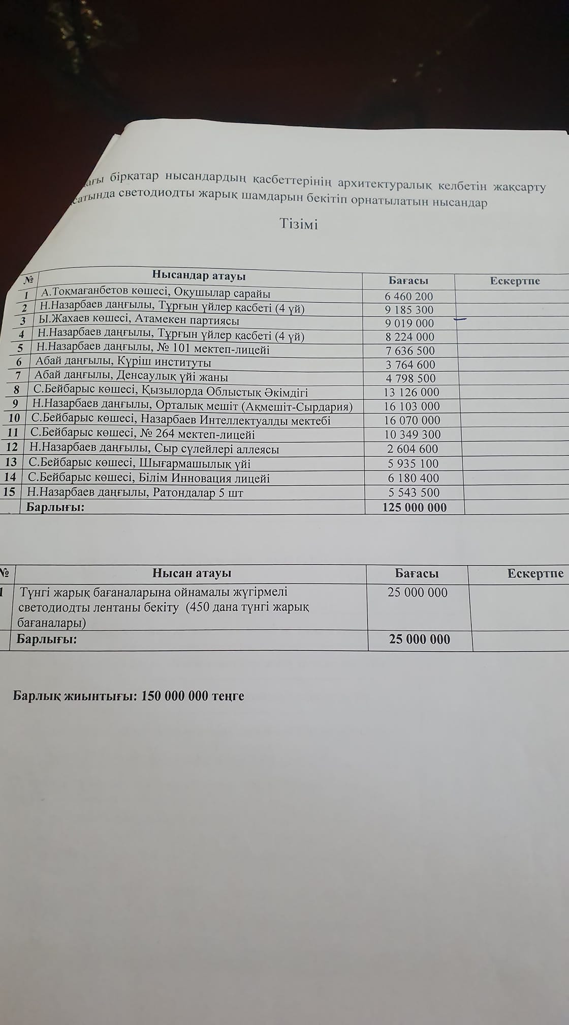 В подтверждение своих слов Анар Изден выложила документ – проект сметы, со списком зданий и суммами.