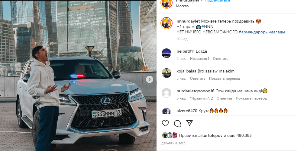 Кстати, этим летом Нурдаулет с другим блогером держал пари, на кону которого как раз стоял его жёлтый Mersedes Тогда Бектурсын проиграл, но, кажется, машина всё ещё при нём, и он её даже поджигает.