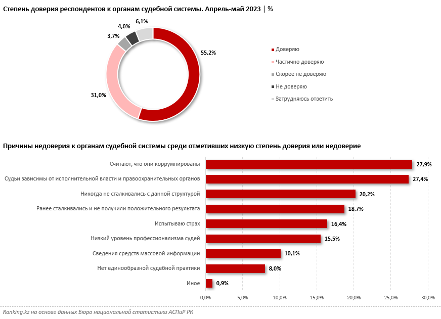 Согласно выборочному исследованию, проведенному в апреле-мае текущего года Бюро нацстатистики АСПиР РК, 55 % респондентов полностью доверяют органам судебной системы, в то время как 31 % опрошенных проявляет к ним частичное доверие, передает Caravan.kz.