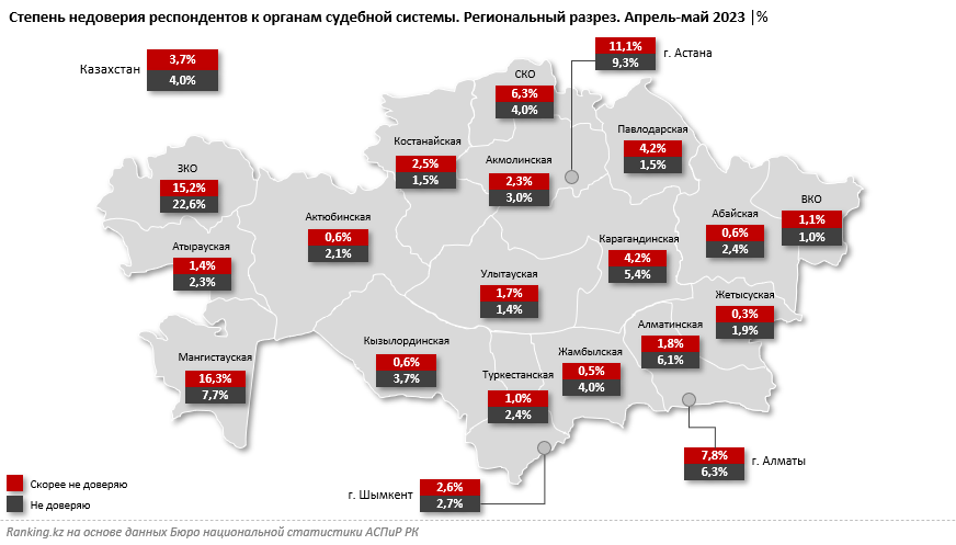 Картина полного недоверия органам судебной системы складывается следующая: среди регионов РК самые серьёзные показатели зафиксированы в Западно-Казахстанской области, где доля таких респондентов составила сразу 22,6 %. Следом идут Астана (9,3 %) и Мангистауская область (7,7 %).