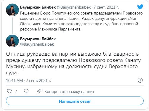— Решением бюро политического совета председателем правового совета партии назначена Назиля Раззак, депутат фракции "Nur Otan", член комитета по законодательству и судебно-правовой реформе мажилиса парламента, — написал он на своей странице в Twitter.