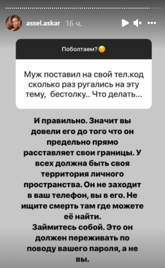 Аскар ответила: "И правильно. Значит, вы довели его до того, что он предельно прямо расставляет свои границы. У всех должна быть своя территория личного пространства. Он не заходит в ваш телефон, вы в его. Не ищите смерть там, где можете её найти. Займитесь собой. Это он должен переживать по поводу вашего пароля, а не вы".