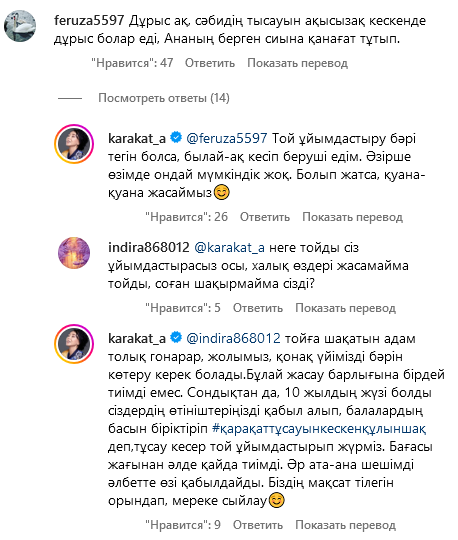 "Если бы провести той можно было бы бесплатно, я бы так и сделала. Пока что у меня такой возможности нет. Но если появится — так и сделаем", — ответила артистка.