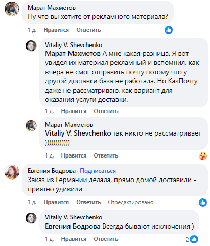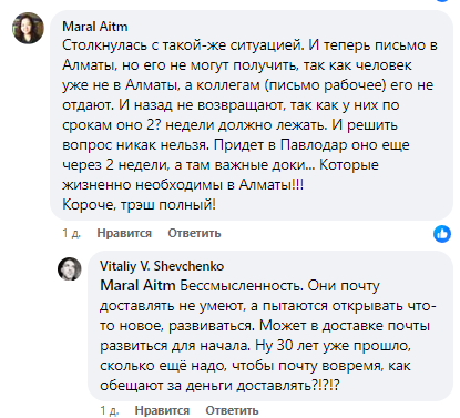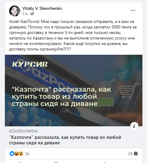 "Мне надо письмо заказное отправить, а я вам не доверяю. Потому что в прошлый раз, когда заплатил 5000 тенге за срочную доставку в течение пяти дней, мое письмо месяц каталось по Казахстану, и вы, не выполнив оплаченную услугу, мне ничего не компенсировали. Какие ещё покупки на диване, вы доставку почты организуйте?!" — написал Виталий Шевченко.