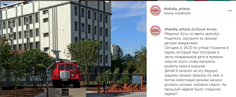 В Нур-Султане пожаловались на поведение детей в парке, построенном в честь пожарных, передает Caravan.kz со ссылкой на группу @zhaloby_astana.