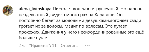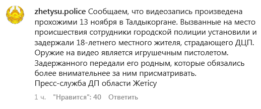 "Город Талдыкорган. Неизвестный мужчина, похоже что с диагнозом ДЦП, гуляет по городу с пистолетом", — говорится в комментарии к видео.