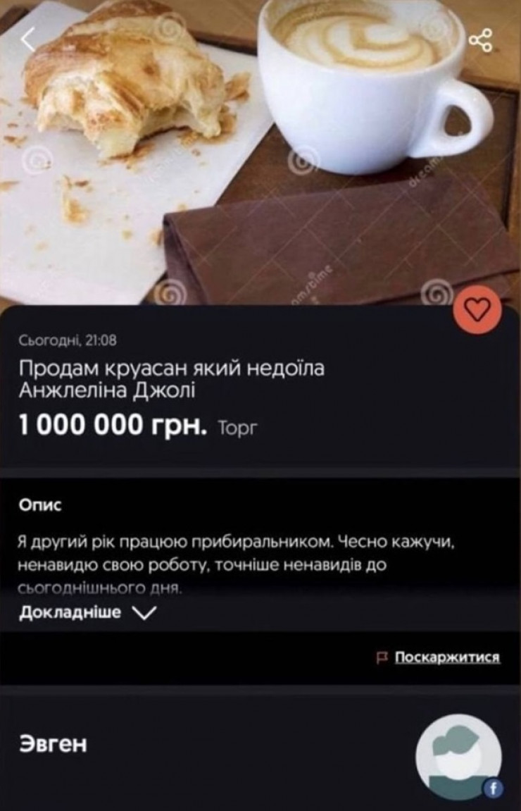Житель Украины по имени Евгений выставил на продажу круассан, который, по его утверждению, не доела в кафе Анджелина Джоли во время визита во Львов 30 апреля, передает Tengrinews.kz.
