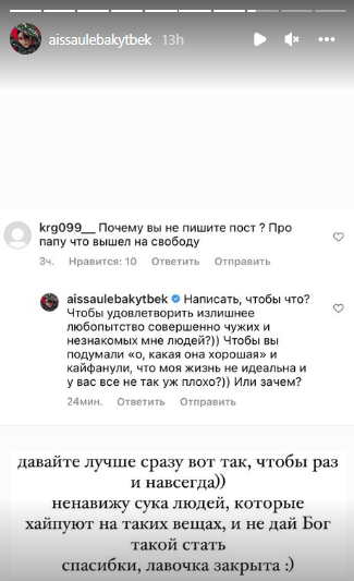 У Айсауле Бакытбек спросили: "Почему вы не пишете пост? Про папу, что вышел на свободу".