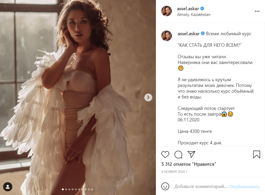 Также стоит отметить, что Асель активно рекламирует свои платные курсы о том, как правильно строить отношения с мужчиной.