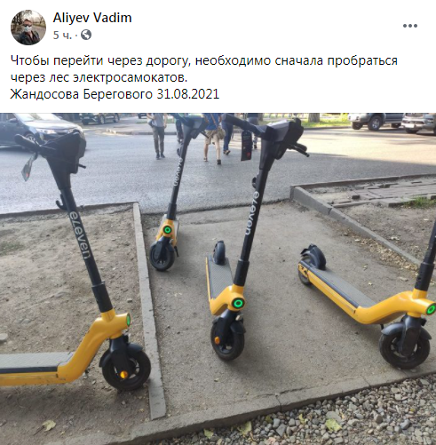 "Чтобы перейти через дорогу, необходимо сначала пробраться через лес электросамокатов. Жандосова — Берегового, 31.08.2021", — пожаловался алматинец в городском паблике.