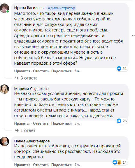 "Неужели никто не наведет порядок в этой сфере?", "Всё-таки нужны специальные отведённые места. А то и около подъездов, на узких проходах оставляют самокаты", "Кто инициатор этого транспорта? Кто получает деньги за прокат? Как всегда, никакого порядка, никакой ответственности", — пишут алматинцы в комментариях.