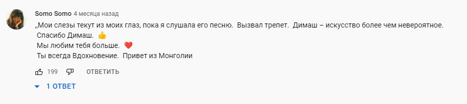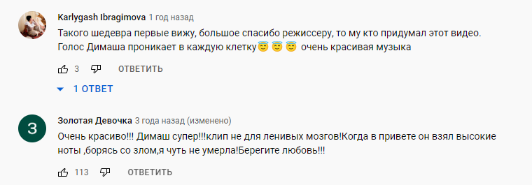 Вообще песни Димаша о любви способны вызывать у людей сильные и спорные чувства. Например, клип на песню "Я скучаю по тебе" даже визуально нагнетает тоску и грустное настроение, потому что он чёрно-белый и посвящён тоске по любимой женщине, с которой лирический герой песни в разлуке, и неизвестно, по какой причине.