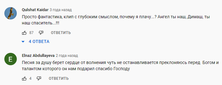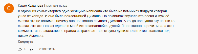 В одном из комментариев под видео пользовательница Сауле Кожанова написала очень мрачную, и вместе с тем показательную историю. По её словам, на поминках поклонницы Димаша поставили эту песню, и хотя муж умершей раньше не понимал увлечения жены Димашем, после этого спросил: "Что этот казах сделал с моей истосковавшейся душой?"