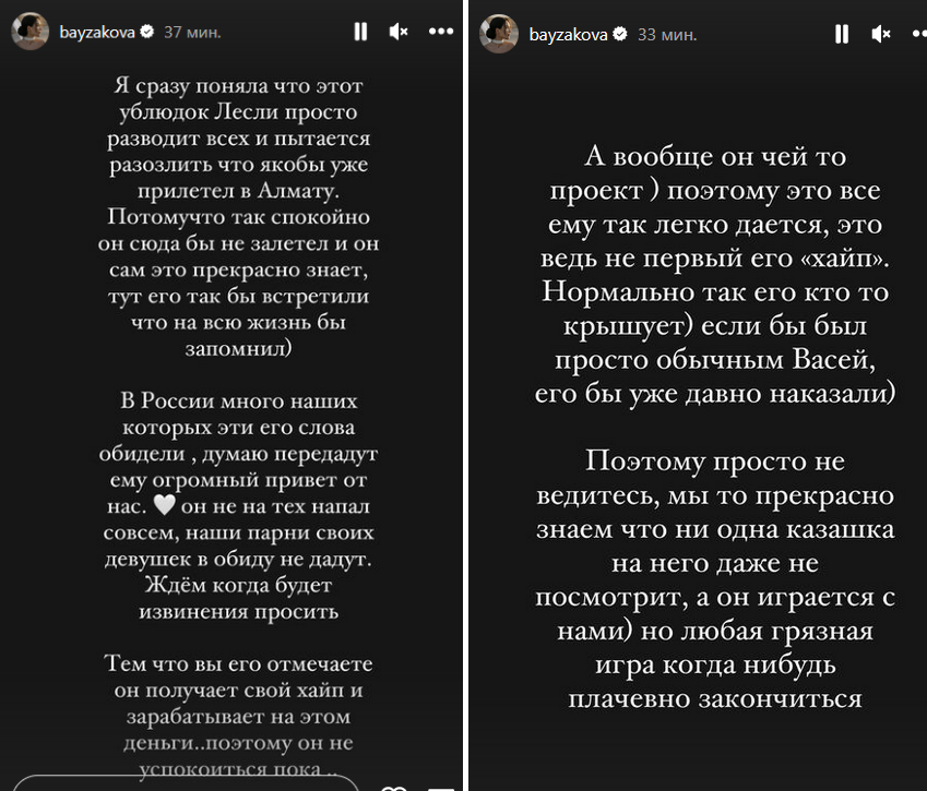 "Я сразу поняла, что этот Лесли просто разводит всех и пытается разозлить, что якобы уже прилетел в Алматы. Потому что так спокойно он сюда бы не залетел, и он сам это прекрасно знает, тут его так бы встретили, что на всю жизнь бы запомнил.