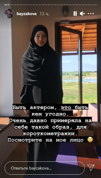 Байзакова показала некоторые свои сценические образы и призналась, что для одной из короткометражек она надевала хиджаб. "Посмотрите на моё лицо", — написала Айжан.
