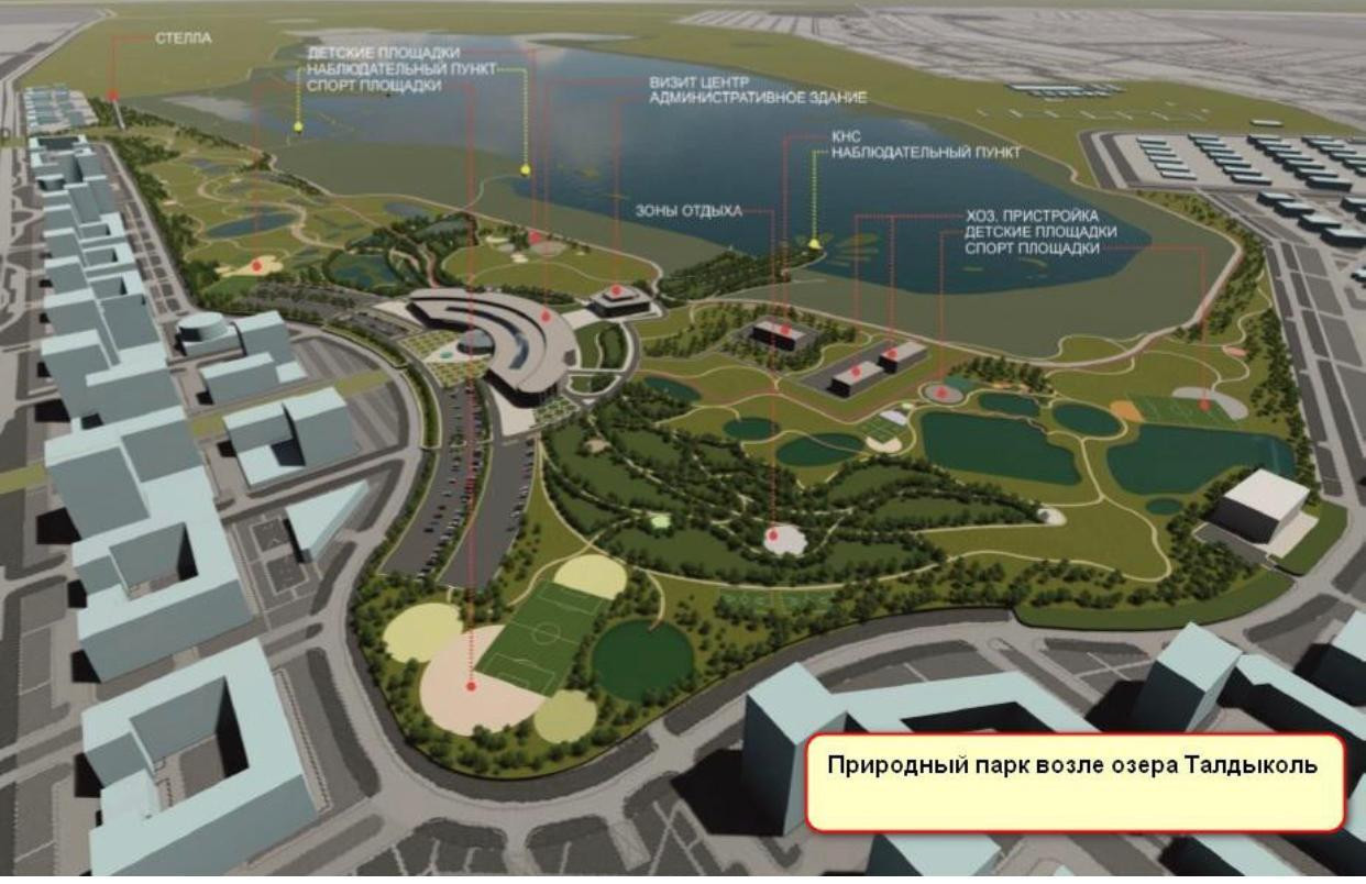 Стоит отметить, что на самом Талдыколе (Большой Талдыколь) будет своя экологическая инфраструктура. Возле озера Талдыколь появится первый в стране природный парк с заповедной и лесопарковой зоной. Не менее привлекательным местом станет второй экопарк – у озера Майбалык (юго-восточная сторона по направлению в аэропорт).