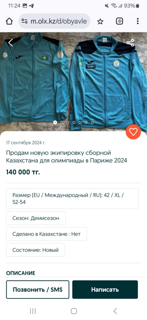 «Продам экипировку Сборной Казахстан для летних Олимпийских игр в Париже 2024 и Токио 2020. “Парижская 2024” — спортивка с футболкой , размер: XL (52); “Токийская 2020” — спортивка с футболкой , размер: 2XL (52/54). Данный комплект вы не найдете нигде, так как выдавались только олимпийцам», — пишет автор объявления.