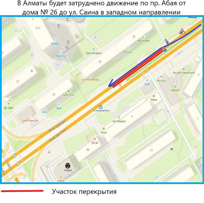 Для обеспечения безопасности ремонтных работ с 23:00 часов 13 июня до 08:00 часов 14 июня движение автотранспорта по проспекту Абая от дома №26 до улицы Саина в западном направлении будет затруднено.