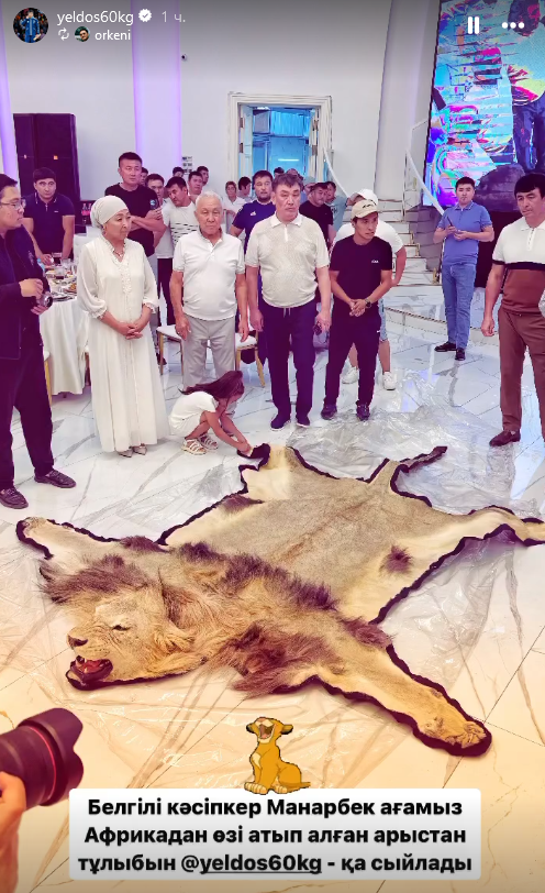 Вечером в честь чемпиона состоялся большой той, на которой Елдосу подарили львиную шкуру. Подпись гласит, что предприниматель по имени Манарбек лично застрелил этого льва в Африке.