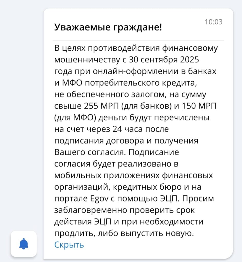 «В целях противодействия финансовому мошенничеству с 30 сентября 2025 года при онлайн-оформлении в банках и МФО потребительского кредита, не обеспеченного залогом, на сумму свыше 255 МРП (для банков) и 150 МРП (для МФО) деньги будут перечислены на счет через 24 часа после подписания договора и получения Вашего согласия», — предупреждает сообщение.