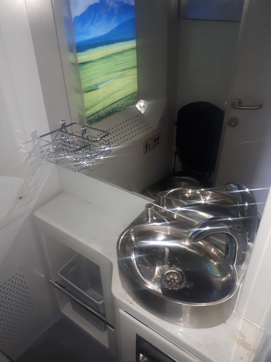 Из соображений гигиены в туалетах размещены раковины с бесконтактным сенсорным краном. При этом ледяной воды в поездах больше не будет — вода будет прогреваться до 40 градусов.