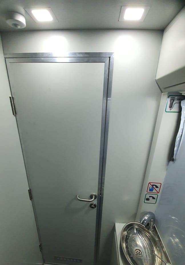 Свет и вентиляция будут включаться, как только пассажир зайдет в кабину. Рядом с дверью устанавливается индикатор «занятости» — он горит красным или зеленым. Такой же индикатор появится в проходе, чтобы люди не вставали в очереди и со своего места видели, свободен ли туалет.