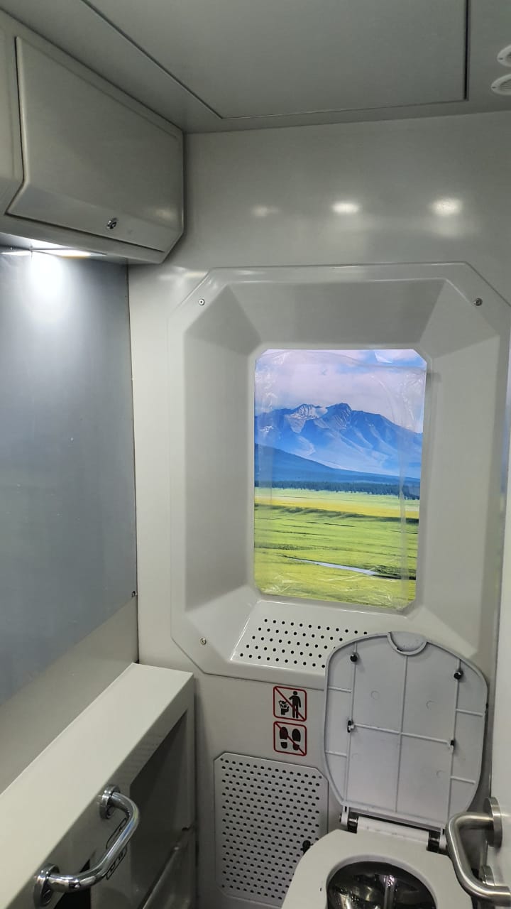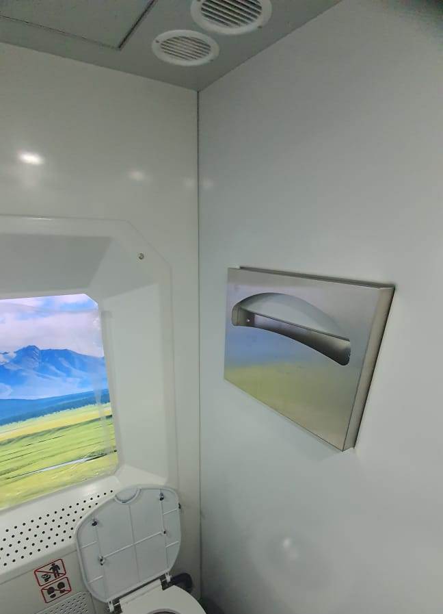 Для ощущения пространства и комфорта в туалетной кабине предусмотрено антивандальное полимерное зеркало, а вместо привычного окна нанесено полупрозрачное изображение.