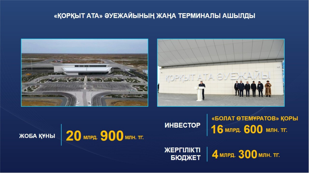 На строительство инженерно-коммуникационной инфраструктуры аэропорта, автомобильной дороги, благоустройство и проведение освещения из местного бюджета было выделено более 4 млрд 300 млн тенге.