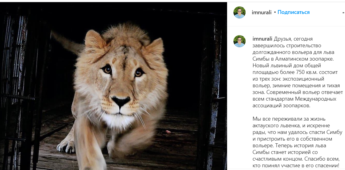 "Друзья, сегодня завершилось строительство долгожданного вольера для льва Симбы в Алматинском зоопарке. Новый львиный дом общей площадью более 750 кв.м. состоит из трех зон: экспозиционный вольер, зимние помещения и тихая зона", — сообщил на своей странице в Instagram казахстанский бизнесмен, основатель фонда Snow Leopard Foundation Нурали Алиев.