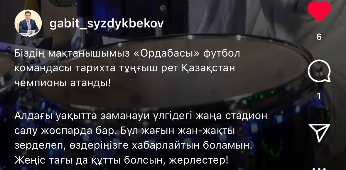 Поводом для заявления стал первый в истории ФК "Ордабасы" титул чемпиона Казахстана по футболу. На матч против карагандинского "Шахтера" пришло столько болельщиков, что стадион имени К. Мунайтпасова не смог вместить всех желающих. По оценкам экспертов, стадион, рассчитанный на 20 тыс зрителей, вчера принял более 23 тыс. человек.