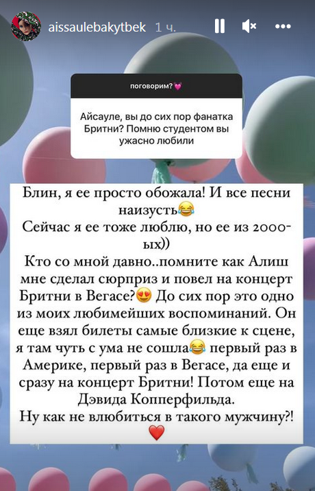 "Я ее просто обожала! И все песни наизусть. Сейчас я ее тоже люблю, но ее из 2000-х. Кто со мной давно, помните, как Алиш мне сделал сюрприз и повел на концерт Бритни в Вегасе? До сих пор это одно из моих любимейших воспоминаний. Он еще взял билеты, самые близкие к сцене, я там чуть с ума не сошла. Первый раз в Америке, первый раз в Вегасе, да еще и сразу на концерт Бритни! Потом еще на Дэвида Копперфильда. Ну как не влюбиться в такого мужчину?" — написала Айсауле.