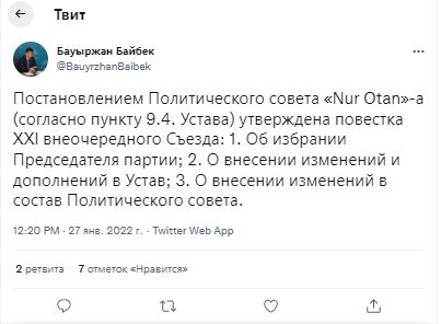 Напомним, что внеочередной съезд партии Nur Otan пройдет 28 января.